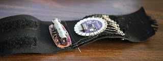 The electronics were first stitched onto a piece of fabric, then transferred to a wide band of elastic with velcro bands as fasteners."